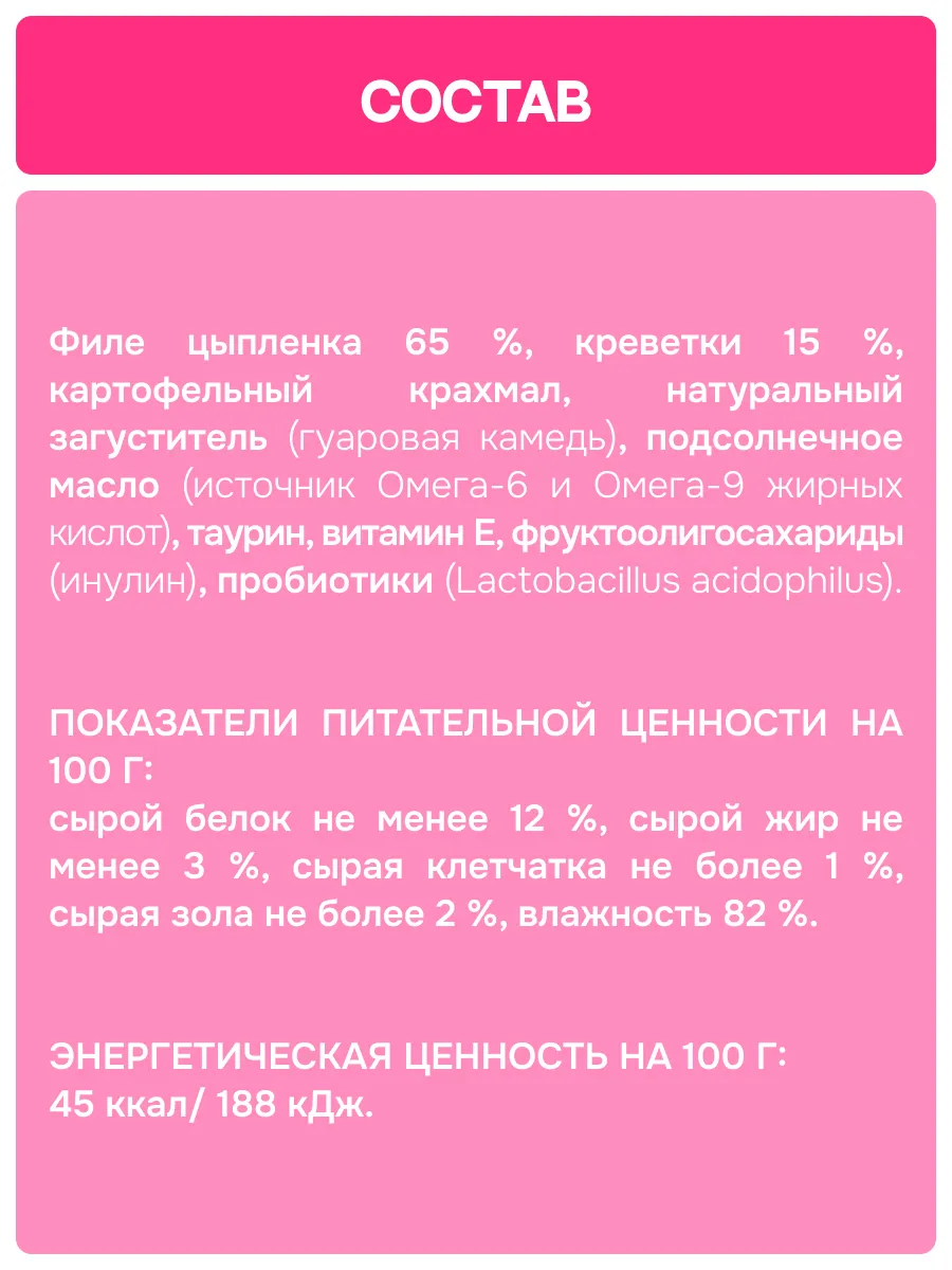 Филе цыпленка 65 %, креветки 15 %, картофельный крахмал, натуральный загуститель (гуаровая камедь), подсолнечное масло (источник Омега-6 и Омега-9 жирных кислот), таурин, витамин Е, фруктоолигосахариды (инулин), пробиотики (Lactobacillus acidophilus).