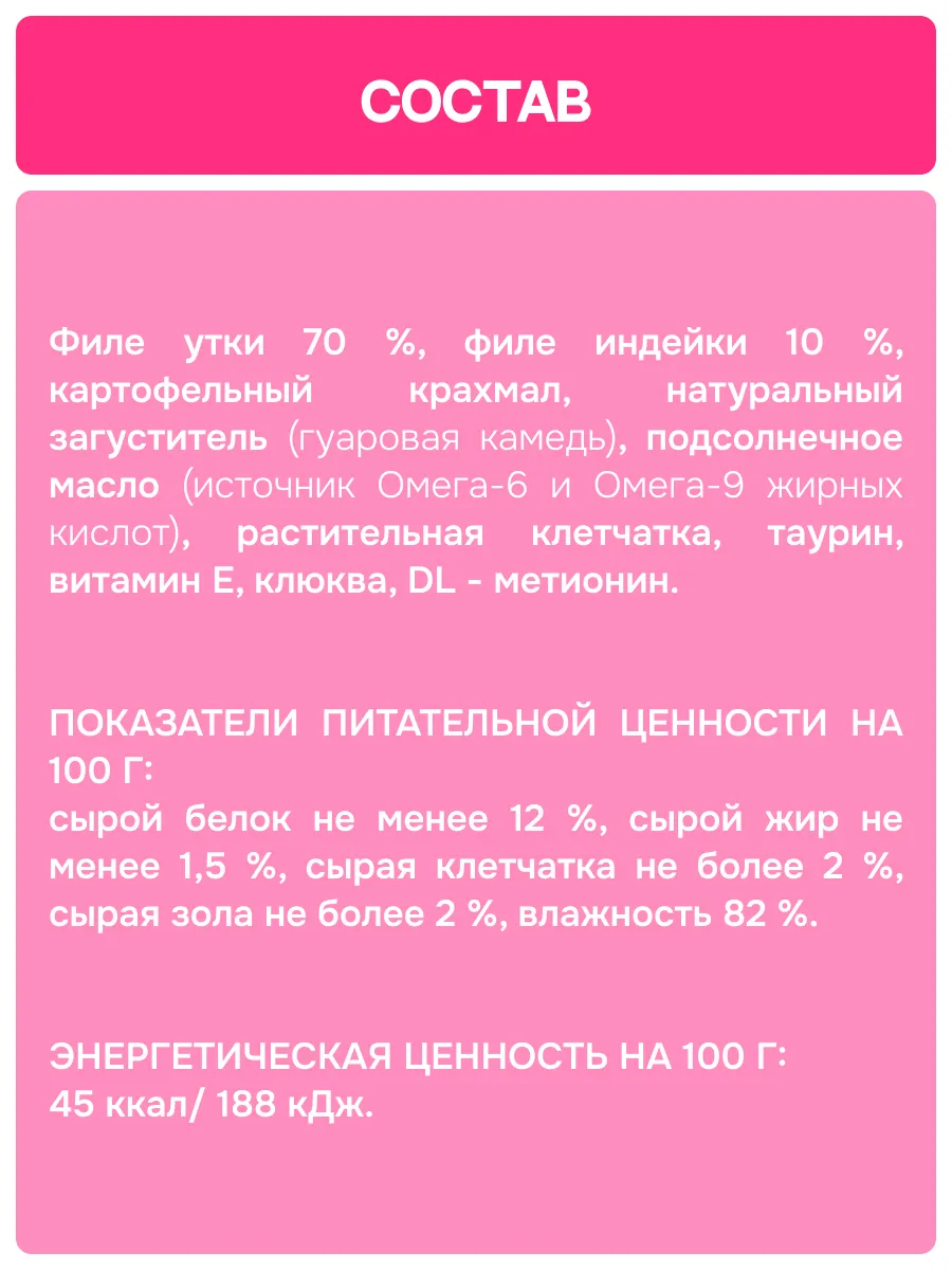 Филе утки 70 %, филе индейки 10 %, картофельный крахмал, натуральный загуститель (гуаровая камедь), подсолнечное масло (источник Омега-6 и Омега-9 жирных кислот), растительная клетчатка, таурин, витамин Е, клюква, DL - метионин.