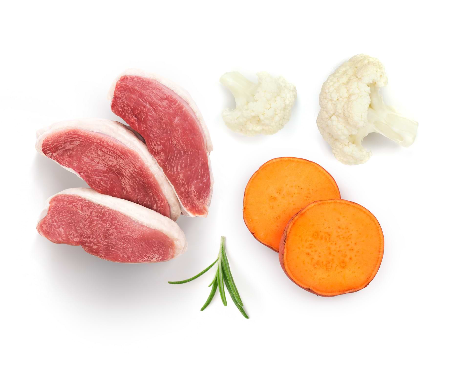 Свежее мясо утки – основной источник животного белка. Мясо богато незаменимыми аминокислотами и поразит даже самого искушенного питомца своим незабываемым вкусом и ароматом. Батат и цветная капуста – основной источника углеводов и клетчатки. Легко усваиваемые, богаты витаминами и являются отличной альтернативой зерновым кормам при пищевой непереносимости и аллергии у питомца. |