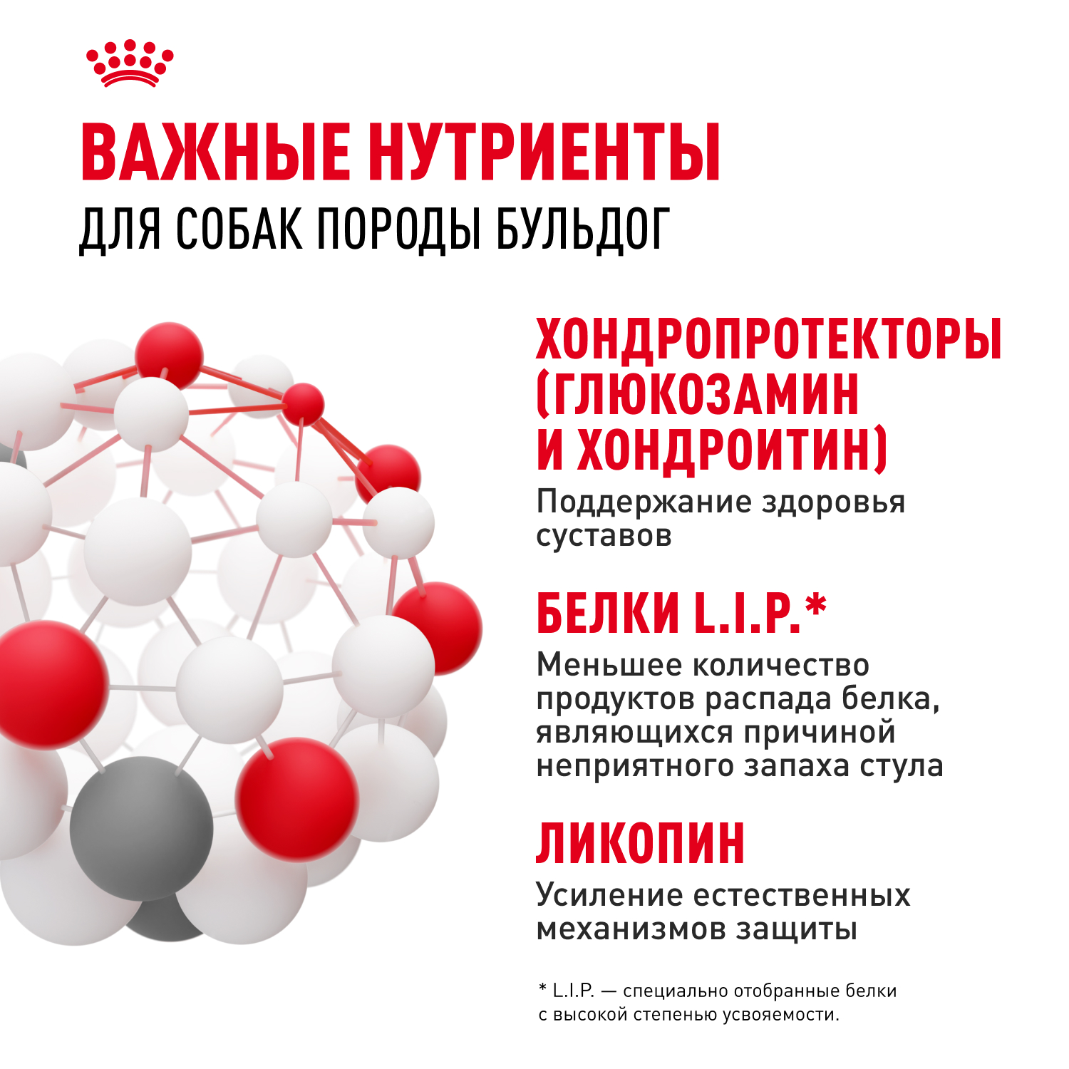 Сухой полнорационный корм для взрослых собак породы английский бульдог старше 12 месяцев — BULLDOG ADULT от ROYAL CANIN®. Специально создан с учетом потребностей вашего питомца.