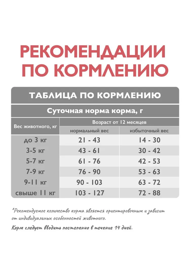 Состав: Мясо птицы 48 % (дегидрированное мясо индейки 27 %, свежее мясо и субпродукты индейки 17 %, свежее мясо утки 4 %), рис цельнозерновой, ячмень цельнозерновой, животный жир 7,5 % (источник Омега-6 жирных кислот), желтый горох, клетчатка свекловичная, растительный протеин (в том числе картофельный и гороховый), гидролизованный животный белок 3,5 %, витаминно-минеральный комплекс, пивные дрожжи, сушеное яблоко (источник растворимых пребиотических волокон), сушеная морковь, льняное семя, холин-хлорид, таурин, DL-метионин, корень цикория, новозеландская мидия (источник хондропротекторов), розмарин, экстракт цветков календулы лекарственной (источник каротина, органических кислот и витаминов, профилактирующих заболевания ЖКТ и стимулирующих регенерацию кожи и шерсти), сублимированные ягоды клюквы (источник органических кислот, профилактирующих МКБ), хондроитин, глюкозамин, антиоксиданты (витамин Е, экстракт розмарина, натуральные токоферолы), L-карнитин, юкка Шидигера.