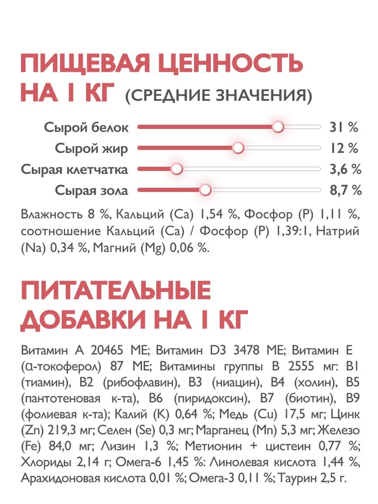 ПИТАТЕЛЬНЫЕ ДОБАВКИ НА 1 КГ (СРЕДНИЕ ЗНАЧЕНИЯ): Витамин A 20465 МЕ; Витамин D3 3478 МЕ; Витамин Е (α-токоферол) 87 МЕ; Витамины группы В 2555 мг: В1 (тиамин), В2 (рибофлавин), В3 (ниацин), В4 (холин), В5 (пантотеновая к-та), В6 (пиридоксин), В7 (биотин), В9 (фолиевая к-та); Калий (K) 0,64 %; Медь (Cu) 17,5 мг; Цинк (Zn) 219,3 мг; Селен (Se) 0,3 мг; Марганец (Mn) 5,3 мг; Железо (Fe) 84,0 мг; Лизин 1,3 %; Метионин + цистеин 0,77 %; Хлориды 2,14 г; Омега-6 1,45 %: Линолевая кислота 1,44 %, Арахидоновая кислота 0,01 %; Омега-3 0,11 %; Таурин 2,5 г.