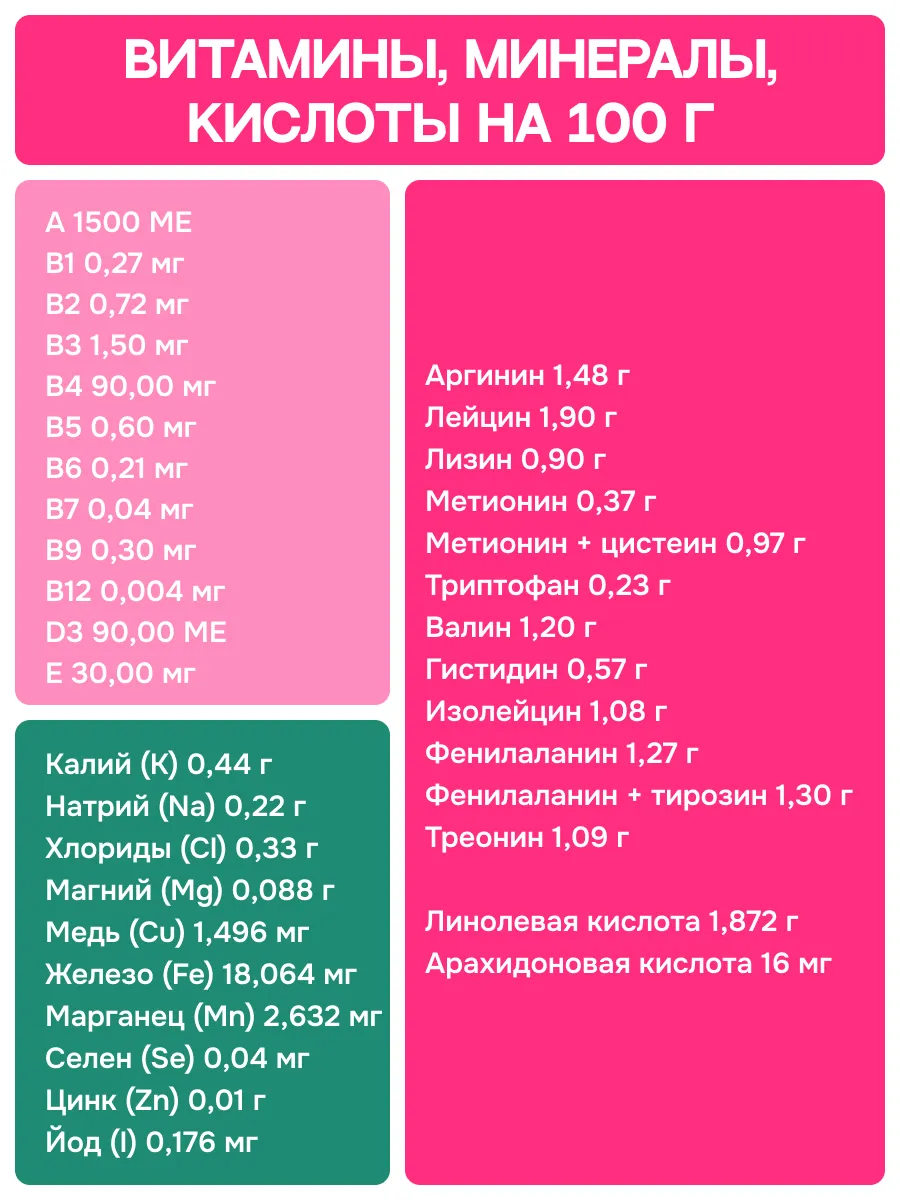 Витамины: Витамин A 1500 МЕ, Витамин В1 (тиамин) 0,27 мг, Витамин В2 (рибофлавин) 0,72 мг, Витамин В3 (никотиновая кислота) 1,50 мг, Витамин В4 (холин) 90,00 мг, Витамин В5 (пантотеновая кислота) 0,60 мг, Витамин В6 (пиридоксин) 0,21 мг, Витамин В7 (биотин) 0,04 мг, Витамин В9 (фолиевая кислота) 0,30 мг, Витамин В12 (кобаламин) 0,004 мг, Витамин D3 90,00 МЕ, Витамин E (α-токоферол) 30,00 мг.