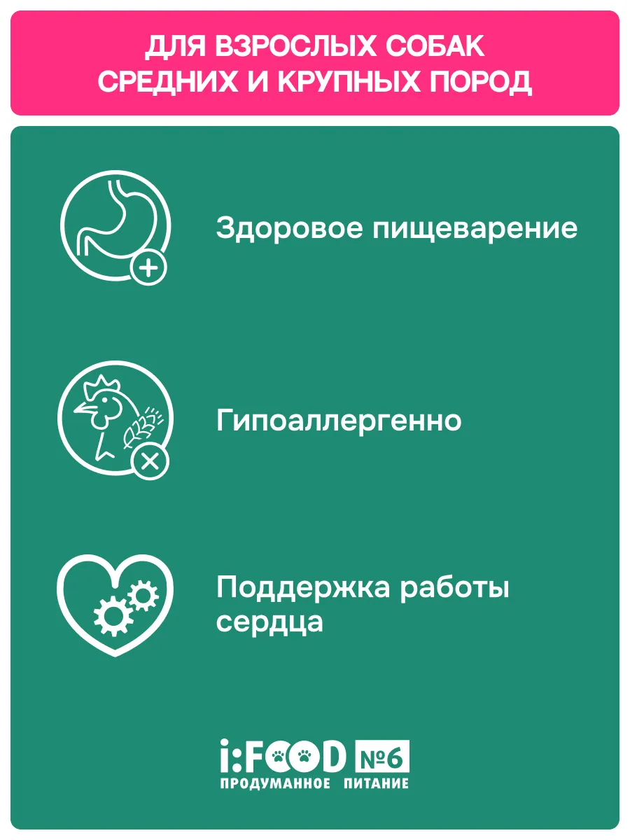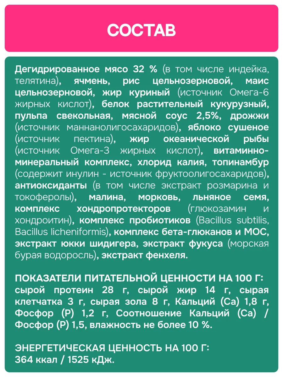 Дегидрированное мясо 32 % (в том числе индейка, телятина), ячмень, рис цельнозерновой, маис цельнозерновой, жир куриный (источник Омега-6 жирных кислот), белок растительный кукурузный, пульпа свекольная, мясной соус 2,5%, дрожжи (источник маннанолигосахаридов), яблоко сушеное (источник пектина), жир океанической рыбы (источник Омега-3 жирных кислот), витаминно-минеральный комплекс, хлорид калия, топинамбур (содержит инулин - источник фруктоолигосахаридов), антиоксиданты (в том числе экстракт розмарина и токоферолы), малина, морковь, льняное семя, комплекс хондропротекторов (глюкозамин и хондроитин), комплекс пробиотиков (Bacillus subtilis, Bacillus licheniformis), комплекс бета-глюканов и МОС, экстракт юкки шидигера, экстракт фукуса (морская бурая водоросль), экстракт фенхеля.