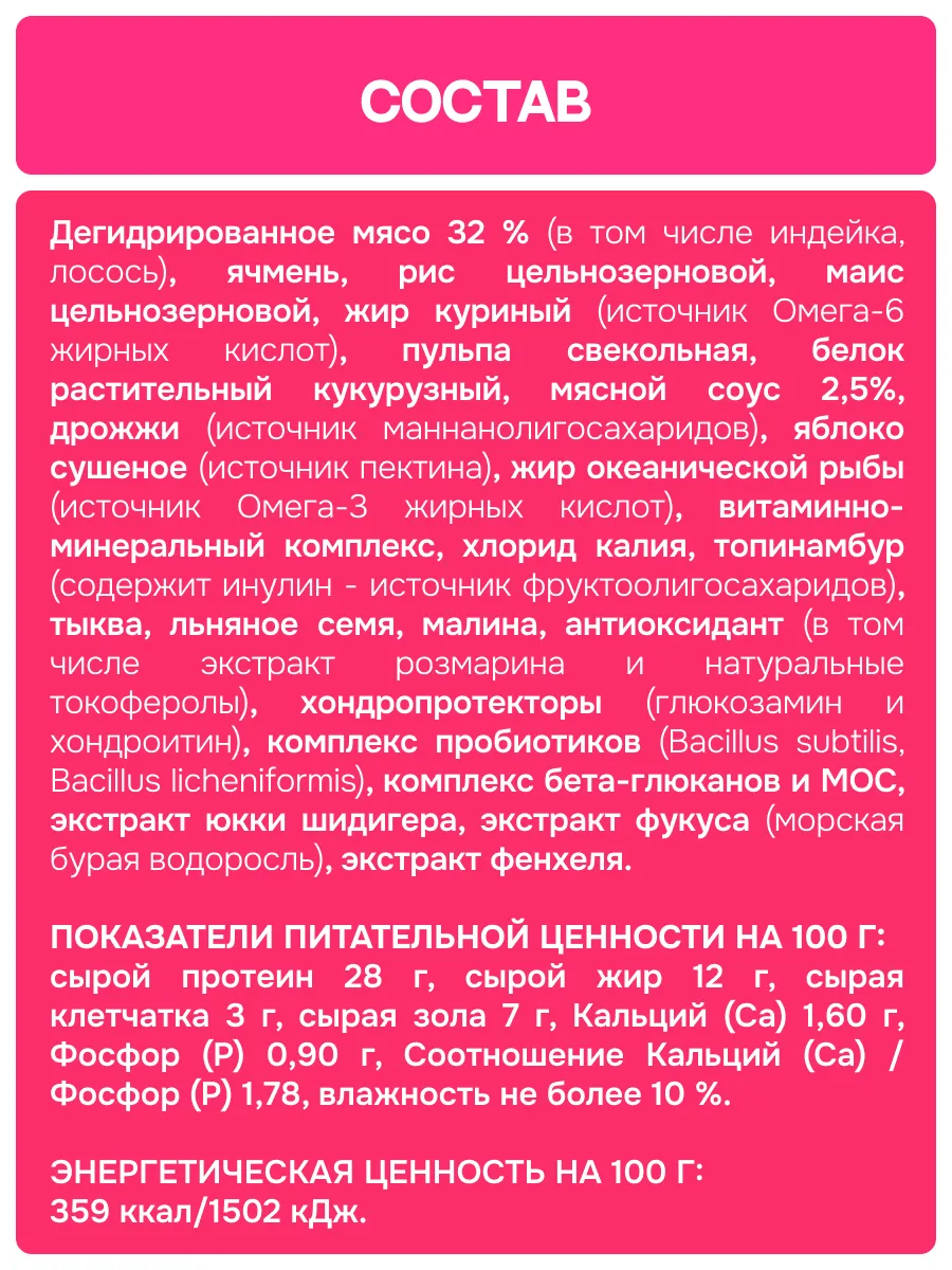 Дегидрированное мясо 32 % (в том числе индейка, лосось), ячмень, рис цельнозерновой, маис цельнозерновой, жир куриный (источник Омега-6 жирных кислот), пульпа свекольная, белок растительный кукурузный, мясной соус 2,5%, дрожжи (источник маннанолигосахаридов), яблоко сушеное (источник пектина), жир океанической рыбы (источник Омега-3 жирных кислот), витаминно-минеральный комплекс, хлорид калия, топинамбур (содержит инулин - источник фруктоолигосахаридов), тыква, льняное семя, малина, антиоксидант (в том числе экстракт розмарина и натуральные токоферолы),хондропротекторы (глюкозамин и хондроитин), комплекс пробиотиков (Bacillus subtilis, Bacillus licheniformis), комплекс бета-глюканов и МОС, экстракт юкки шидигера, экстракт фукуса (морская бурая водоросль), экстракт фенхеля.