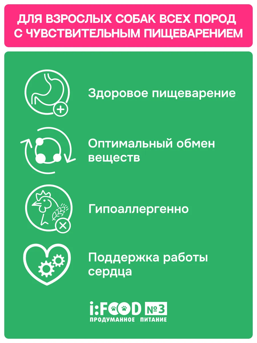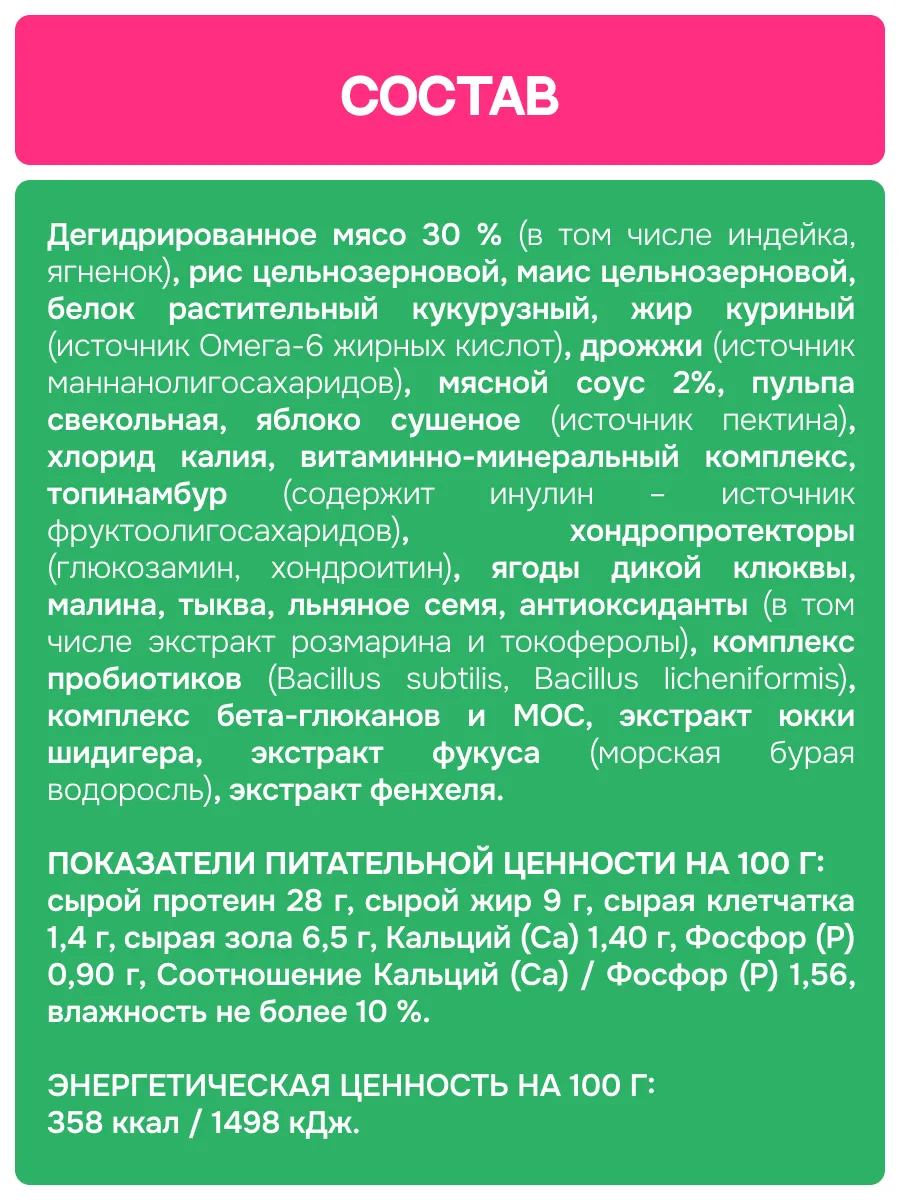 Дегидрированное мясо 30 % (в том числе индейка, ягненок), рис цельнозерновой, маис цельнозерновой, белок растительный кукурузный, жир куриный (источник Омега-6 жирных кислот), дрожжи (источник маннанолигосахаридов), мясной соус 2 %, пульпа свекольная, яблоко сушеное (источник пектина), хлорид калия, витаминно-минеральный комплекс, топинамбур (содержит инулин – источник фруктоолигосахаридов), хондропротекторы (глюкозамин, хондроитин), ягоды дикой клюквы, малина, тыква, льняное семя, антиоксиданты (в том числе экстракт розмарина и токоферолы), комплекс пробиотиков (Bacillus subtilis, Bacillus licheniformis), комплекс бета-глюканов и МОС, экстракт юкки шидигера, экстракт фукуса (морская бурая водоросль), экстракт фенхеля.
